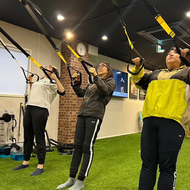 TRXというトレーニング器具を使用するトレーニング、体重を負荷にしてトレーニングしたり、より正しいフォームでトレーニングができるようにサポートしてくれるため、ケガのリスクが比較的低く、体のバランスや筋力、柔軟性、体幹の強化などを目指す方にとてもおすすめです。
