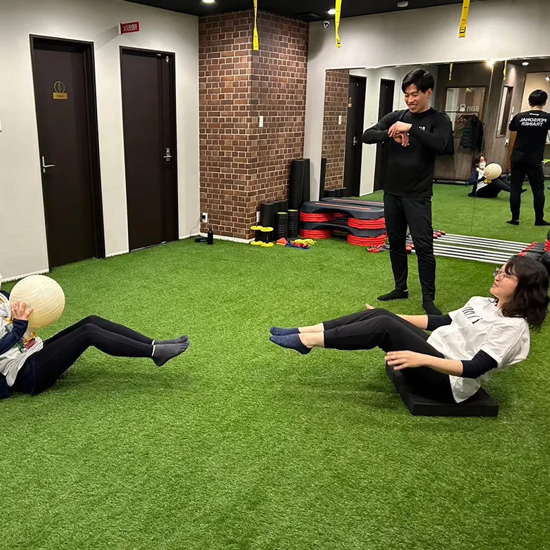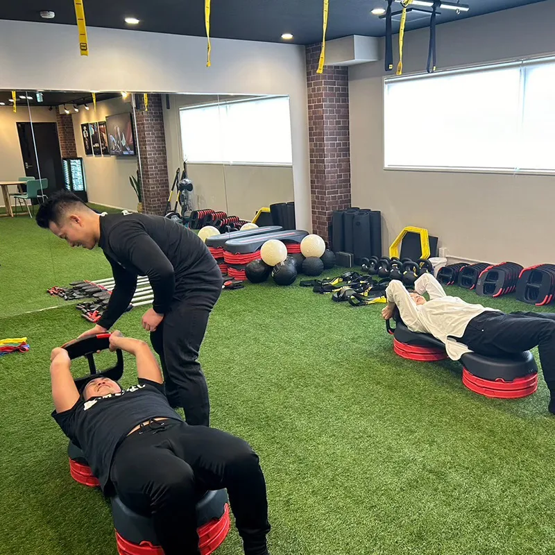 人工芝を敷き詰めた広々としたスペースとハダシでトレーニングする手軽さが魅力。人工芝でトレーニングをする事によって、足の裏の神経の刺激を感じ、普段使わない筋肉を使う事により、身体の筋のバランスや歪みを整え不定愁訴などの体調不良の改善にも役に立ちます。お客様はシューズ不要ご来店して頂けます♪